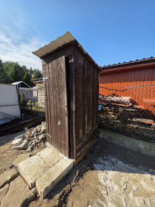 Oddam drewniany wychodek widoczny na zdjęciach. Stabilna i solidna konstrukcja, która idealnie sprawdzi się na budowie lub działce.