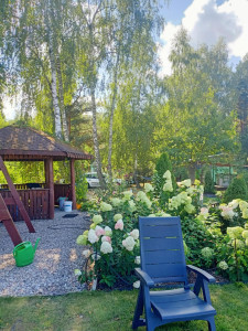 Na posesji wolnostojący garaż, budynek gospodarczy, altana. Ogród zagospodarowany: duża ilość drzew, krzewów i kwiatów. Dominują olbrzymie krzewy hortensji i róż a także drzewka owocowe. Zraszacze do trawy, studnia głębinowa do podlewania ogrodu. Teren Natura 2000.