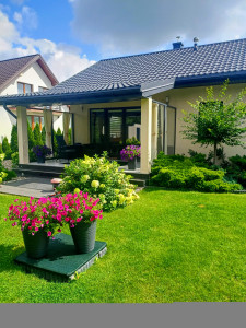 Na posesji wolnostojący garaż, budynek gospodarczy, altana. Ogród zagospodarowany: duża ilość drzew, krzewów i kwiatów. Dominują olbrzymie krzewy hortensji i róż a także drzewka owocowe. Zraszacze do trawy, studnia głębinowa do podlewania ogrodu. Teren Natura 2000.