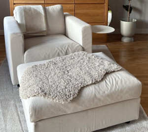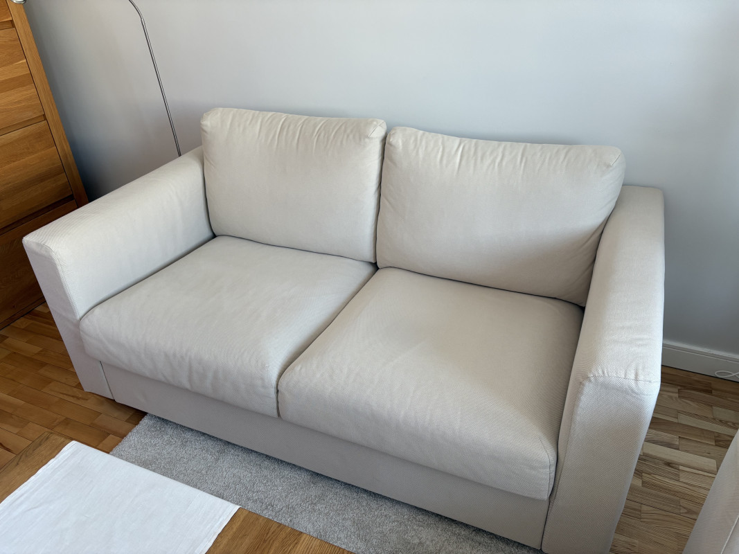 Pokrycie to tkanina Hallarp w kolorze beżowym (80% bawełna, 20% poliester), stan bardzo dobry, kupione w październiku 2024. Pokrycie mebli jest zdejmowane i nadaje się do prania w pralce. Do zestawu dokładam zapasowe pokrycie na kanapę.
