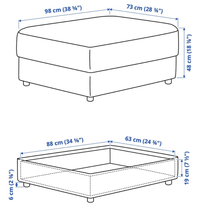 Zestaw wypoczynkowy składa się z 4 elementów: 2 kanap dwuosobowych, fotela i podnóżka ze schowkiem.